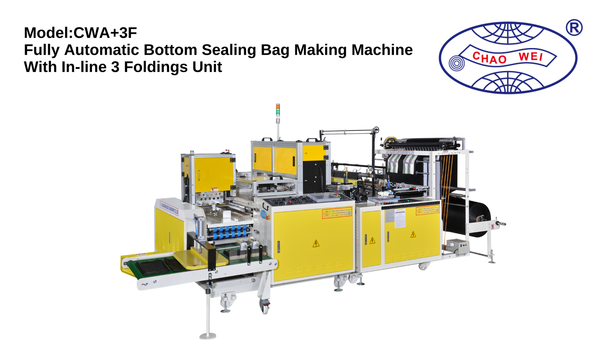 CWA+3F is for bottom sealed bags with 3 times folding, first 2 times folding of bag’s length and last time folding of bag’s width at maximum speed 80 bags/min.
