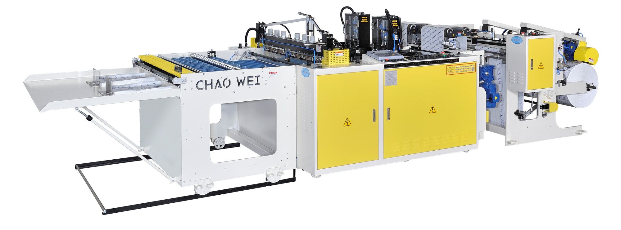 Plastic bag making machine CW-1200FK-SV/CW-1400FK-SV is suitable for the production of 2 lines printed or non printed bottom sealed bags with or without D punch. This machine is equipped with 2 servo motors to control bag feeding individually, 2 photocells to catch printing on plastic film, 1 servo motor to control flying knife function and impulse wire sealing device to produce heavy duty bottom sealed bags.