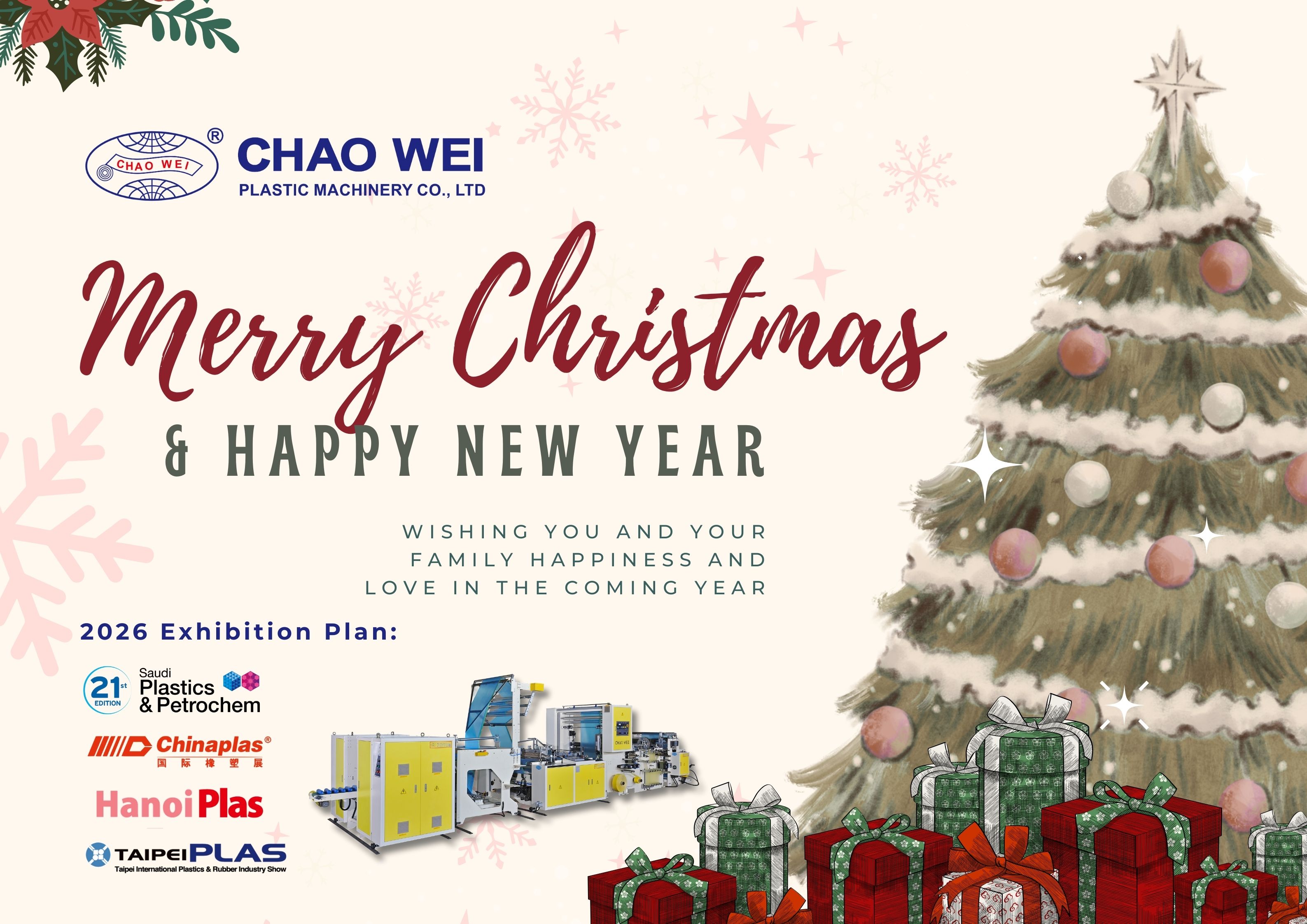 As the year draws to a close, the team at CHAO WEI Plastic Machinery Co., Ltd. extends our warmest wishes for a Merry Christmas and a Happy New Year!