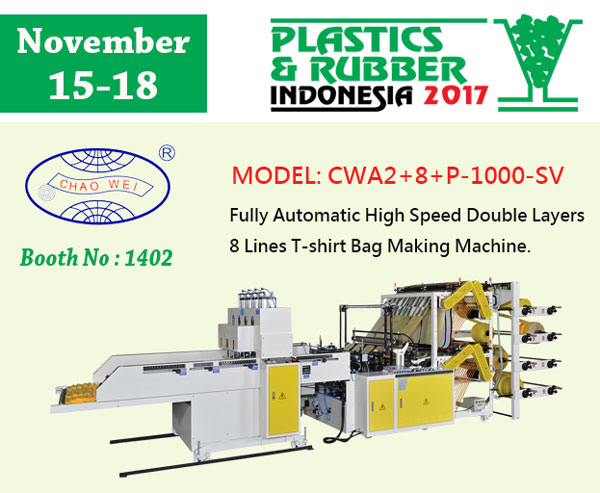 During 15-18 November 2017, CHAO WEI is going to participate the big show-Plastics & Rubber in Indonesia. This time we will demonstrate “Fully automatic high speed double layers 8 lines T-shirt bag making machine” which is the most popular model in Indonesia. CHAO WEI sincerely welcomes you to visit us at booth #1402.