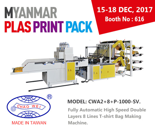 The biggest plastic industries exhibition in Myanmar-“Myanmar International PPP” will be held in Yangon during 15-18 Dec. As Myanmar’s market is getting more and more open, CHAO WEI PLASTIC MACHINERY definitely won’t miss this big event. During the exhibition, we present “Fully Automatic high speed double layer 8 lines T-shirt bag making machine” which is very popular in Myanmar local market. Please do not hesitate to visit our booth at #616 and you will be impressive with our wonderful machine.